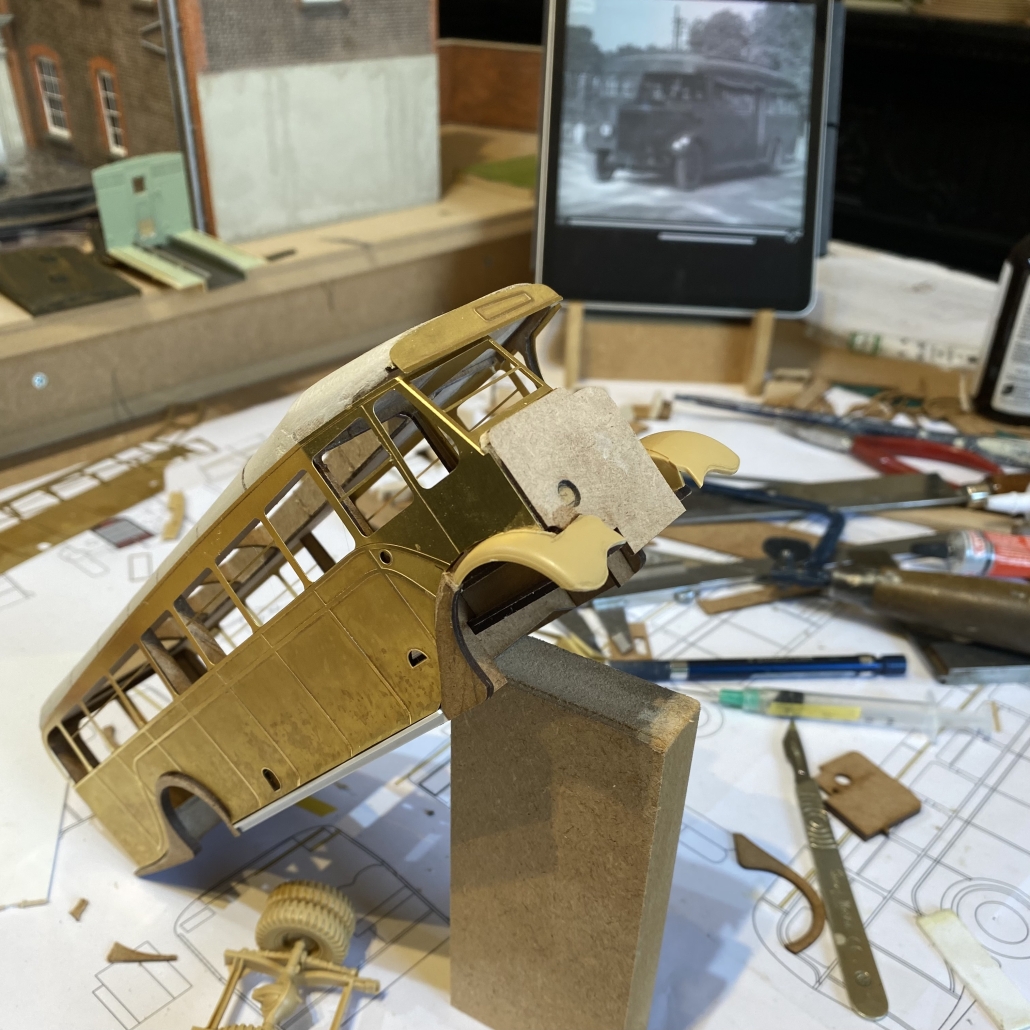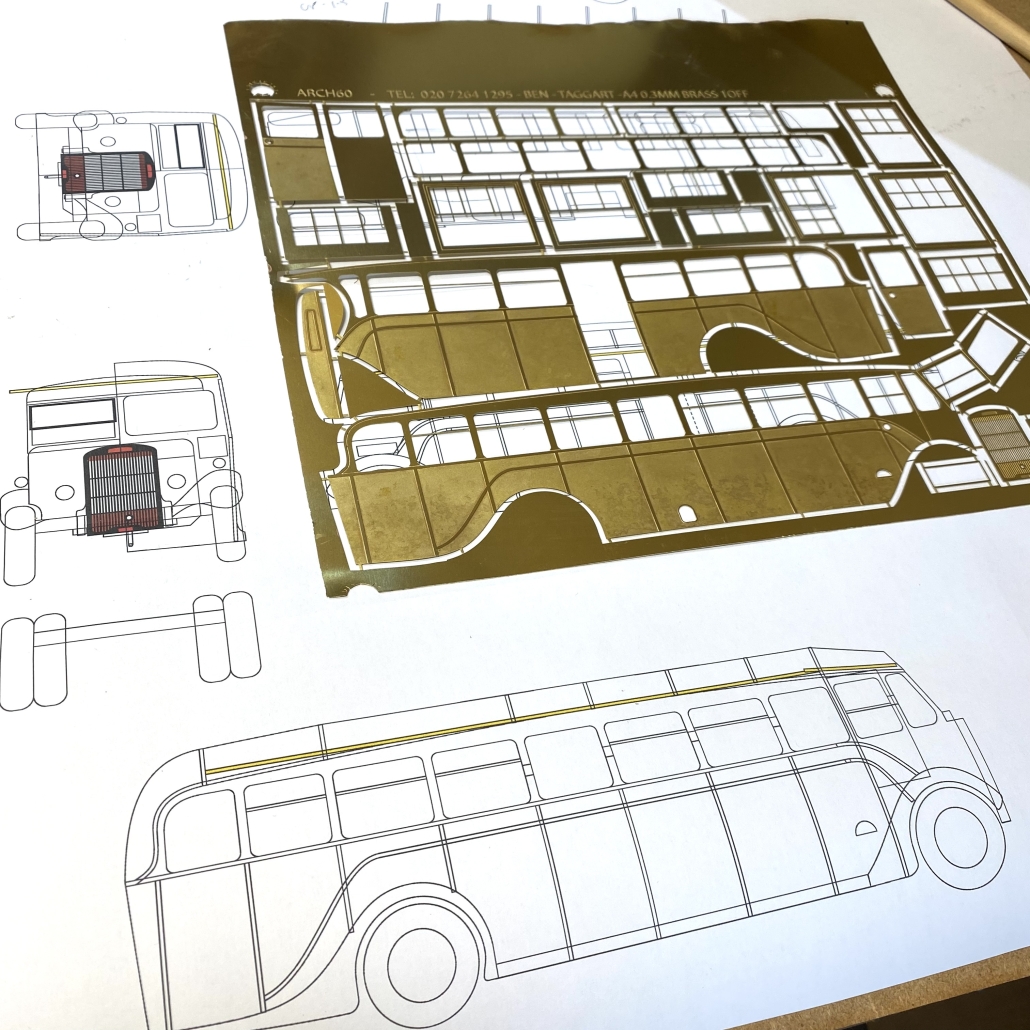 It’s been nearly a year since I started work on the model of Trent Park a former second World War prison camp, now being refurbished as a brand new museum Trent Park House of Secrets in Cockfosters, north London. I’ve got to know every detail of the building and have carried out exhaustive research. During this time I discovered that there was a short film held at the Imperial War Museum’s archives showing two German prisoners arriving by bus on 22nd May 1943. I wanted to include this unfolding scene in my model, so I started on how I was going to make the bus. I soon discovered that it was a Leyland Tiger- in fact, for any bus enthusiasts, a TS6 manufactured around 1936, but that every one of these buses was slightly different, as Leyland only made the chassis and the design of the coaches was left to small companies. Having found some close matches to our bus, I drew detailed plans to work from, had my drawings transferred to brass sheet and then began to construct the model in wood.