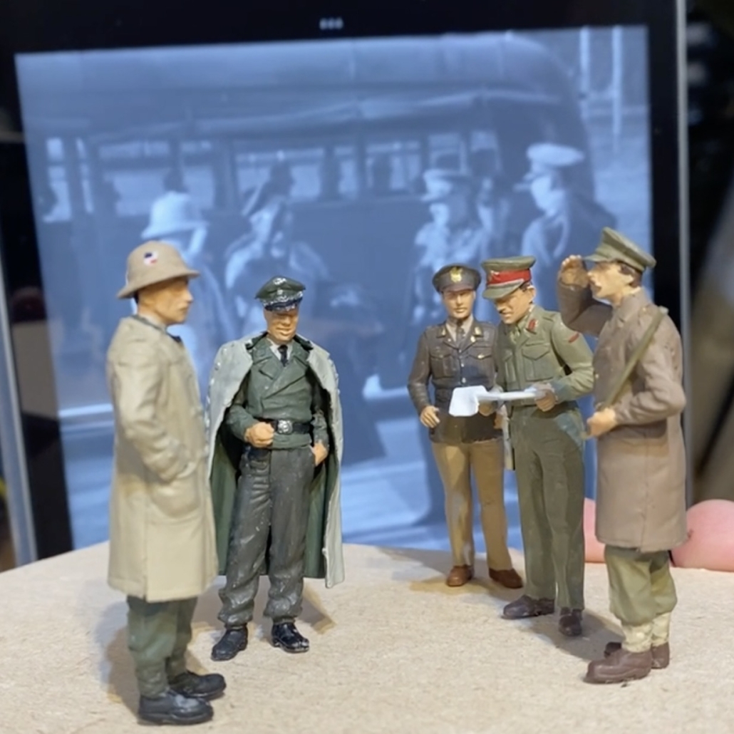 The War office film showed the arrival of Generalleutnant Gotthard Frantz (wearing a helemet) and Generalmajor Carl Peter Köchy. Frantz was captured in Tunisia when the 19th Flack Division surrendered on 6th May. Köchy had been airfield district commandant in Tunis until his capture captured on 10th May. The prisoners are shown, met by Major Topham. The German generals talking with Colonel Richardson and All these figures will be positioned on my model as the project draws to a close.